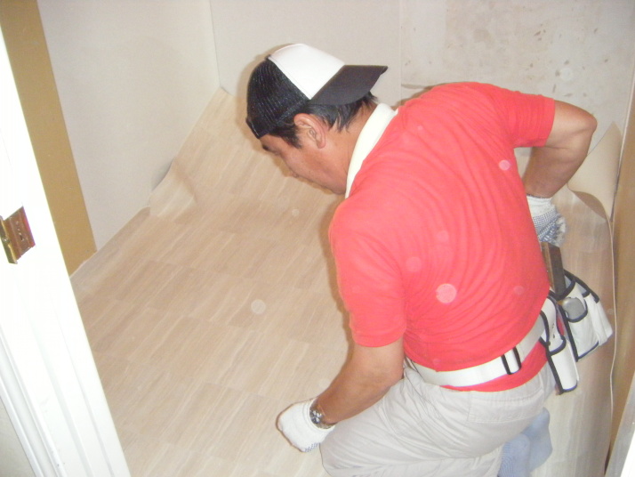 床を新設した後、CF(クッションフロアー)の重歩行タイプを施工。動物の堅い爪でも平気です。